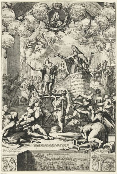 Adriaen Lommelin created this allegorical title page with the defeated Envy as an engraving. Notice how the composition is structured around a central globe, a sphere of knowledge dominating the scene, with figures arranged in dynamic opposition. An angel, radiant with divine light, stands triumphant, piercing the prostrate figure representing Envy with a spear. This is countered by the poised stance of the female figure, possibly representing piety, who holds a cross while standing alongside a shield. The snaking forms introduce an element of disruption. The figures at the bottom draw the viewer's eye downward, grounding the celestial battle in a human context. The stark contrast between light and shadow emphasizes the ideological struggle, a visual rhetoric typical of the period. The very act of engraving, with its meticulous lines, reinforces a sense of order and control, even within the tumultuous scene it depicts.