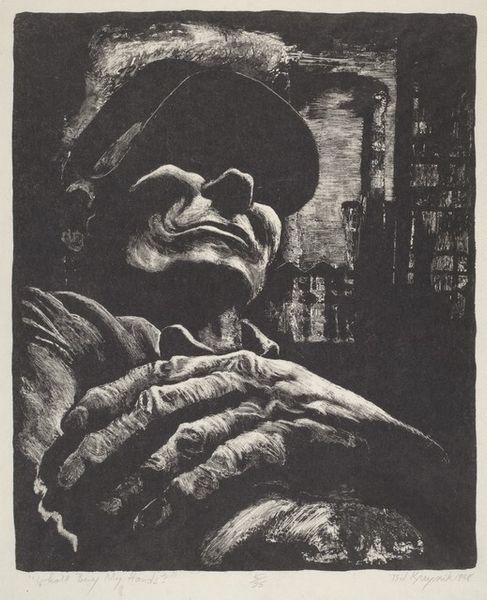 Fritz Eichenberg created this wood engraving, "Indian Pottery Vendor," in the United States. The stark contrast between black and white immediately draws our attention to the texture and form, inviting us to explore the story within its visual architecture. The composition is dominated by the pottery vendor’s intense gaze, juxtaposed with a dark array of pots above. Eichenberg masterfully uses the wood engraving technique to create depth and dimension through dense crosshatching and stark lines. These lines aren't just descriptive; they build a palpable sense of weight and pressure, hinting at the burden carried, both literally and metaphorically. The artist employs a high-contrast palette to emphasize the textures and patterns on the vendor's clothing, contrasting with the smooth, dark surfaces of the pottery. This use of form and texture serves a symbolic purpose, underscoring themes of labor, survival, and the human condition. The vendor's upward gaze and the looming pottery create a dynamic tension, inviting viewers to contemplate the complexities of representation and social narrative within the print.