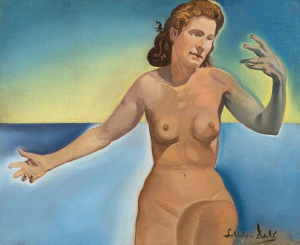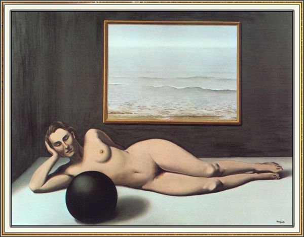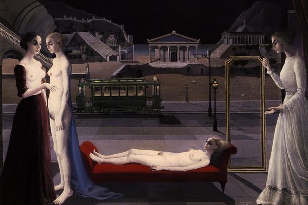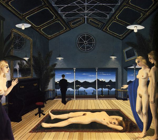 Curator: Paul Delvaux painted “Dialogue” in 1974. What strikes you first about it? Editor: The geometry! The stark, receding planes under these pale nudes and those looming classical columns—all painted in oil. The slick surface contradicts the historical allusions. It’s unsettling, almost manufactured. Curator: The women, seemingly frozen within the colonnade, resonate deeply. These aren't portraits but echoes of the classical nude, vessels carrying Delvaux’s obsessions. Remember the recurring figure of the reclining Venus throughout history—here, they’re staged like silent players in an eternal drama. Editor: The women feel strangely disconnected. It makes me wonder about Delvaux’s methods. Were these painted from life, or were they appropriations from mass media—like the mannequins he also featured? The precise execution is what dominates; these surfaces feel scrubbed clean of process or passion. Curator: Absolutely, these dreamscapes are underpinned by cultural memories, yet stripped of specific narrative. The repeated columns act like visual cues—fragments of remembered architecture representing permanence, stability, order itself—yet destabilized in this impossible landscape. Do they trigger memories of grand historical narratives or, perhaps, evoke a sense of lost origins? Editor: Lost origins indeed. It all looks manufactured, even though it references something 'real'– those Ionic columns or posed models in a life-drawing class. The illusion feels both precise and disturbingly flat, lacking evidence of layering or hand-work that speaks of skill as embodied process, instead of skillful pretense. The painting becomes this cold display of something real filtered through consumerist values. Curator: And that friction is where the magic lies, isn't it? Delvaux doesn't simply recreate; he reframes, creating new symbols from the old. His figures aren't goddesses but representations—vehicles to consider archetypal roles women are compelled to perform in modern society. Editor: Maybe it reveals more about anxieties around production than around archetypes themselves. Looking closely—or not so closely, really—I find his obsession with geometry far more poignant than the figures’ apparent silence.
