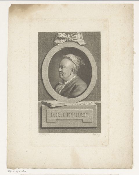 Curator: This image captures the Enlightenment’s faith in reason and order. What strikes you first about it? Editor: A profile so severe! I mean, it gives off an aura of cool authority and controlled power; he's almost entirely stone-faced. Curator: Gottlob August Liebe created this portrait of Abraham Gotthelf Kaestner sometime between 1771 and 1819, so it is from the late 18th century, maybe even early 19th. Editor: This image comes from paper, right? Its materiality seems to emphasize its role in documentation, as historical evidence. What more do you know about Kaestner and why Liebe may have made this image? Curator: Well, it is actually an engraving. Kaestner was a prominent mathematician and professor. Given his significance, commissioning or distributing his portrait through print would certainly amplify his intellectual influence across society. Think of it as social capital. Editor: Indeed! This neat oval shape within the stark rectangle confines him, but it also elevates him—sets him apart with the ornamental ribbon above. It's like, 'here stands reason.' The lines are so meticulous, very Neoclassical. But even a simple, elegant design can't fully conceal the sitter's rather… pronounced nose. Was this flattery or reality? Curator: Well, Neoclassicism embraced idealized forms, yes, yet portraiture demands a likeness, doesn't it? This nose reads almost as a symbolic stand-in for character, or maybe just, well, his face. I agree the lines are sharp and precise which are a testament to the engraver's skill, and contribute to the portrait's overall formality and gravitas. We must consider this portrait within its historical context. In its creation and reception, this imagery certainly shaped perceptions of Kaestner as a learned figure. Editor: Agreed. The medium is integral; engraving here wasn't just a practical choice. It served an ideological function to present authority via controlled artistic practices and proliferation of an aesthetic vision across various societal echelons. And now we engage with it in a very different time, for yet another purpose. It's intriguing how it continues to reverberate in this space. Curator: Absolutely. It certainly invites consideration of how cultural memory gets crafted through very formal portraiture practices.