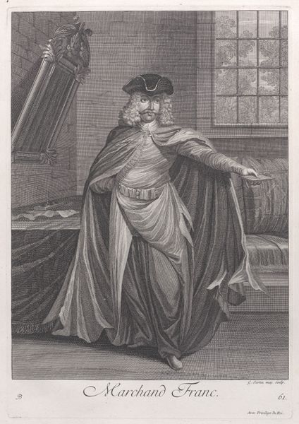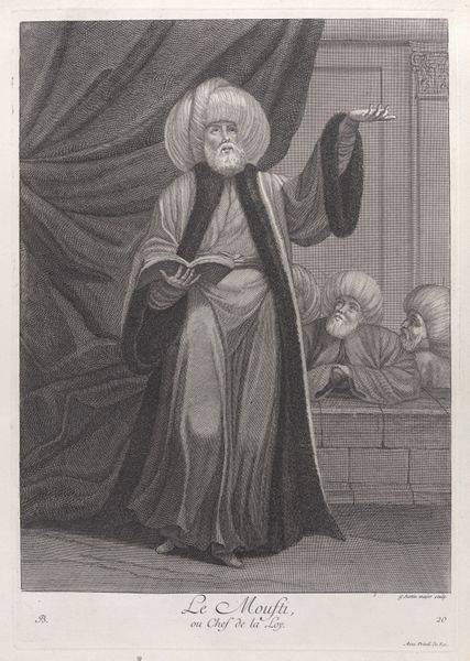 Jean Baptiste Vanmour created "Le Grand Visir, en Habit et en Turban de ceremonie" as an engraving, offering a glimpse into 18th-century perceptions of Ottoman dignitaries. The composition immediately draws the eye to the commanding figure of the Grand Vizier. He is positioned to the right of the image, and his raised hand creates a diagonal line that guides our gaze upwards, emphasizing his authority and power. The artist uses line and shading to meticulously render the textures of the Vizier’s ceremonial garments. This contrasts with the veiled figures in the background. Vanmour’s print invites us to consider how cultural and power dynamics were visualized and communicated through formal artistic means. The detailed rendering and structured composition do not merely depict a scene but also encode a complex interplay of cultural representation and artistic interpretation.