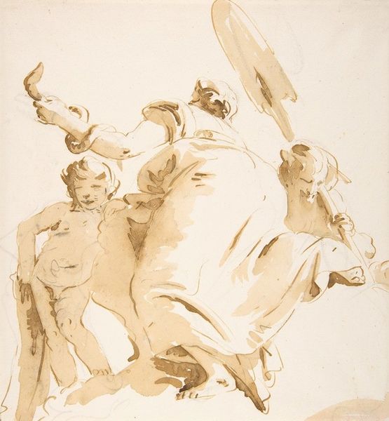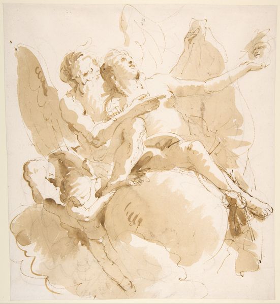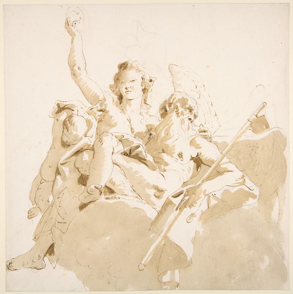 Curator: The drawing before us, titled "Winged Putto Crowning a Seated Woman Who Looks Upward", is attributed to Giovanni Battista Tiepolo and was created sometime between 1696 and 1770. Editor: My immediate reaction is one of upward momentum. The whole composition strains toward the heavens, caught in sepia tones, as if viewed through antique glass. Curator: Indeed. Consider the semiotic elements at play. The seated woman, draped in classical robes, gazes heavenward as the winged putto, a cherubic figure, prepares to crown her. This suggests the crowning of virtue, or perhaps divine favor. Editor: Precisely! And crowning ceremonies are heavily coded images. Note the crown, a traditional emblem for power and, or heavenly sanction. The wings symbolize divine messengers. And in terms of its iconographic significance, it's a clear allegory, likely tapping into both classical and Christian motifs. The female gaze and tilted neck suggest yearning and religious acceptance, themes echoed elsewhere in Italian paintings of that time. Curator: But let's not overlook the materiality. Tiepolo's masterful use of wash and line imbues the scene with dynamism. The quick, almost frenetic strokes create a sense of movement and ethereal lightness appropriate for this Baroque style. Editor: Ah, good point! The loose sketch helps further, communicating an air of spiritual aspiration, fitting well within the conventions of religious works of the period. Consider how our psychological response is impacted as well by the angelic features, which suggests beauty. Curator: I concur. The composition is quite arresting. With our examination of line, allegory, symbol, and technique, perhaps now our visitors have fresh ideas about how these formal choices can resonate within the picture plane. Editor: Exactly. The art leaves you musing about the visual symbolism— and the very human desire to reach for something divine or transcendent.