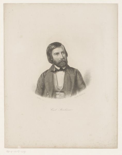 Editor: This is Johann Leonhard Raab's "Portret van Franz von Defregger," created sometime between 1855 and 1899. It’s a print, almost photorealistic in its detail, and the sitter exudes a certain sternness. What symbols jump out at you? Curator: It’s compelling how the engraver captures Defregger, the famous genre painter, as an emblem of the 19th-century artistic establishment. Consider the beard. In this era, beards signified wisdom, artistic credibility, even a link to the Romantics' celebration of the natural man. It visually connects Defregger to a lineage. Editor: So the beard isn't just facial hair; it's a signifier. Interesting. And what about the rest of his attire? Curator: The suit and tie, while seemingly simple, contribute to this image of a respected member of the academy. The bow tie especially can hint at the cultural connections between artists and the cultivated gentry during that period. Even the etching needle held in his right hand—it's both a tool of his trade *and* a symbol of his craft. Raab essentially immortalizes Defregger through his own mastery of engraving, echoing the subjects Defregger chose for his popular paintings. Editor: That’s clever! I wouldn’t have noticed that connection on my own. I suppose I saw a portrait; you see a whole network of symbols representing a cultural moment. Curator: Indeed! By translating Defregger into this precise visual language, Raab perpetuates an image, embedding it deeper into cultural memory. He’s not just showing us what Defregger *looked* like but what he *represented.* Editor: This makes me look at portraits completely differently now. Curator: Precisely! These carefully constructed images often spoke volumes about a person's position within their society.