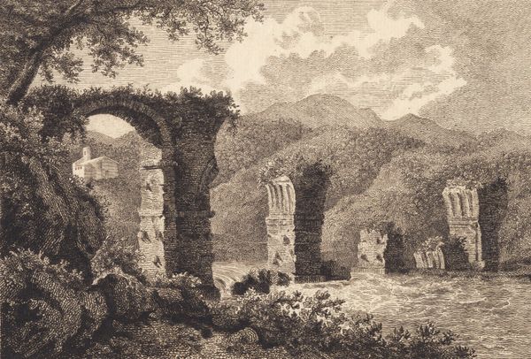 Curator: This is "Landscape Looking Through Ruined Archway" by Thomas Sully, rendered in watercolor. What strikes you immediately about this piece? Editor: Crumbling grandeur. Seriously, I feel like I’m peeking through a forgotten cathedral. It’s like the bones of history are right there. Kinda romantic, right? Curator: Indeed. The romanticism movement embraced ruins as symbols of the past and as reminders of the fleeting nature of human achievement. Sully places these imposing, ruined arches as a kind of window onto a peaceful landscape. How does that juxtaposition resonate with you? Editor: Well, the quiet little scene beyond—are those cows? Maybe sheep?—creates a soft landing, you know? The wild overtakes, but nature always perseveres. Makes me think about resilience, both of nature and the spirits that may linger. Am I getting too deep? Curator: Not at all. Placing a renewed natural world just beyond this shattered building raises questions. We might ask who built it, who maintained it, who destroyed it, and for what purpose? By not foregrounding the historical narrative, Sully highlights a broader and more eternal perspective: life finds a way. Editor: Exactly! It’s funny how seeing something old and broken can lead to feeling so hopeful. This feels almost hopeful; despite the ruin. The watercolor gives it a translucent light quality, kind of dreamlike and faded. Curator: Watercolor’s delicate quality underscores the sense of fragility and temporality so central to the romantic sensibility. Now, thinking of the vantage point, Sully encourages a consideration of spatial relationships, of who is positioned inside versus outside the arches and perhaps what such borders delineate. Editor: So it makes you think of who's included or excluded, of different types of spaces? Yeah, the eye definitely wants to know what's 'out there', in the field. Almost like a yearning. It's subtle but impactful. This watercolor shows a profound engagement with social justice themes. The ruined structure signifies not just historical changes, but their very social and material consequences, and raises vital considerations about land ownership, social inclusion, and the impact of such decisions on lived experience. Curator: Precisely. What started as a romantic painting becomes charged. Any closing thoughts? Editor: That sometimes, even ruins can frame something beautiful and vital and that you have to be really, really careful when someone builds something that's meant to last forever. Curator: Indeed, time moves on, but through the eyes of Thomas Sully, we too can observe both the past and the future that is in motion.