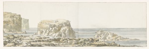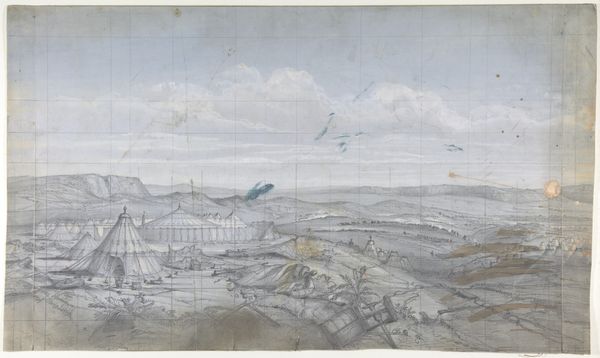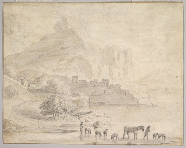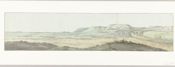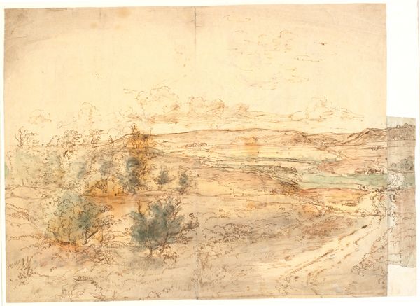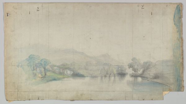 Editor: This is Eugène Cicéri's "Design for a Stage Set at the Opéra, Paris," created sometime between 1830 and 1890 using watercolor and print. It's beautiful! There's a softness to the hills and the overall composition feels vast yet gentle. How do you interpret this work? Curator: I see the labor involved in producing the scene for the opera, which must have been enormous in those days. Think about the materiality of the stage set itself: wood, canvas, paints – all constructed to create this illusion. How does knowing this design would become something monumental change how you view the artwork itself? Editor: It's easy to forget about all that, focusing on the "art" rather than the construction. That's an interesting point! Does the printmaking element alter how you look at the artwork? Curator: Absolutely! It’s a design for mass production, in a way. The print allows for duplication, distribution, and scaling of the image. The material reality of theater in the 19th century dictated what the audience consumed. Where was the focus, do you think – on the "originality" or on spectacle for paying viewers? Editor: I suppose spectacle for viewers in those times. Seeing it as a plan makes me appreciate the material planning needed, which is almost invisible in the finished product, the spectacle, in other words. Curator: Exactly! It directs our gaze not to the final art object, but toward the immense labor involved, and reveals the socioeconomic implications of such a process. It's all about what *produces* the art. Editor: I never would have thought about it this way. It's helpful to think about the art in relation to its production. Curator: Understanding the art involves focusing on all that the eye often ignores – and perhaps then, the hand rediscovers!