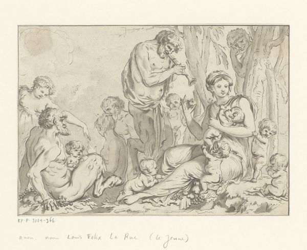 Pietro Testa created this etching, "The Garden of Charity," sometime in the mid-17th century. The monochromatic print depicts a woman surrounded by children within a natural, garden-like setting. Testa’s composition uses line and form to create a scene that feels both intimate and expansive. The linear quality of the etching technique defines the figures and landscape. Look at how the lines vary in thickness and density to model form and create areas of light and shadow. The arrangement of figures creates a dynamic yet balanced composition, with the central figure of Charity anchoring the scene. The surrounding children are carefully placed to guide the viewer's eye, inviting us to explore the themes of nurturing and compassion. Testa’s background in Baroque classicism is evident in the idealized forms and balanced composition, yet he infused his work with a personal, expressive style. His innovative approach to printmaking and his exploration of complex allegorical themes mark him as a significant figure in 17th-century art. Notice the textural complexity achieved through varied etching techniques, adding depth and richness to the overall visual experience.