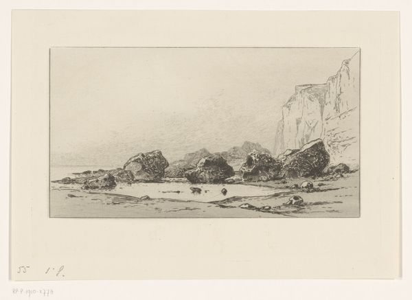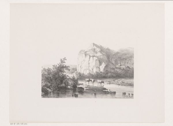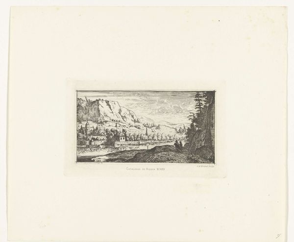 Joseph Hartogensis created this etching titled 'Berglandschap,' or Mountain Landscape, in the mid-19th century. During this period, landscape art served as a powerful vehicle for expressing national identity and cultural pride. Hartogensis, of Jewish heritage, navigated a society marked by both opportunities and limitations. The figures in the artwork invite contemplation about identity and belonging. Are they wanderers, explorers, or perhaps symbols of the artist himself, seeking refuge or connection within the natural world? The mountainous terrain, rendered with meticulous detail, evokes both the sublime grandeur and the potential isolation of the landscape. As you consider this etching, think about how the artist uses the landscape to explore themes of identity, longing, and the search for belonging in a rapidly changing world. 'Berglandschap' serves as a poignant reflection on the human condition.