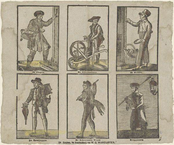 This print, Straatverkopers, by Jan de Lange the second, was made in the Netherlands. The precise date is unknown, but it was likely produced in the first half of the 19th century. It's a lithograph, meaning it was printed from a stone surface, and then hand colored. The figures represent street vendors, each shown with their wares. Look closely, and you can see the textures created by the lithographic process, especially in the areas of shading. The material of the print – humble paper – speaks to its function. This wasn't high art, destined for a museum. It was a commercial product, made in multiples, meant to be sold and consumed by a broad public. Prints like this offer a fascinating glimpse into the economy of the era, documenting the labor of ordinary people. They remind us that even seemingly simple images are the product of complex social and economic forces, connecting the artist, the printer, the vendors, and the consumers in a web of exchange.