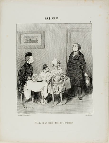 Editor: This lithograph by Honoré Daumier, created in 1857, is titled "Herbal Tea". It's pretty funny – a maid is bringing an enormous sack, presumably of herbs, to a very… unwell looking gentleman. It's almost grotesque in its humor, wouldn't you say? What’s your take on what Daumier's trying to communicate here? Curator: Grotesque, yes, and wonderfully so! To me, Daumier is skewering the pretentiousness of the bourgeoisie playing at being 'ill' or 'delicate'. He’s exaggerating the scene – the ridiculous quantity of herbs, the man's pallor – to lampoon their obsession with remedies and their often-theatrical suffering. Doesn't it also make you think about the vast inequalities of the time? The working class, like the maid, burdened and literally carrying the weight for the pampered elite? Editor: That’s a really good point about class. I was so focused on the humor I hadn't fully considered that aspect. Curator: Daumier was brilliant at layering social commentary within humor, making us both laugh and think. The exaggerated size of the 'hay' versus the small tea set feels deliberate, wouldn't you agree? Perhaps suggesting the ridiculous overindulgence, where the cure is as absurd as the ailment. Editor: Definitely. It's like he's saying, “Look at how ridiculous this whole charade is!” The composition really reinforces that imbalance. Curator: Exactly! It is such an exaggerated parody. Daumier captures something essential about human nature. It feels surprisingly relevant, even today. Editor: It's amazing how much he can convey with just a few lines. I'm going to be thinking about this in my printmaking class!