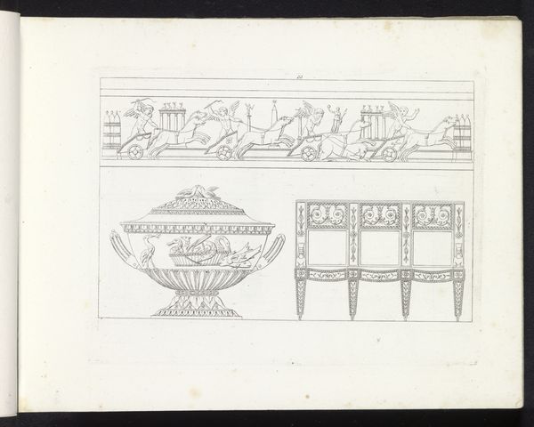 Curator: Look at this exquisite drawing by Pietro Ruga, titled "Ornamentele rand, een vaas, een schaal en een boekenkast," created around 1817. It’s ink on paper. Editor: It's very linear, spare, and strangely calming, wouldn’t you agree? There’s something almost architectural about how these objects are presented; clean lines are defining the overall structure. Curator: Absolutely, that tranquility aligns with Neoclassicism's embrace of order and rationality. Ruga presents familiar forms: a vase, a bowl, a bookcase, each resonating with ancient allusions and aspirations to wisdom. Think of those forms—they're laden with significance far beyond the everyday. Editor: I see your point. Looking closer, one appreciates Ruga’s intricate layering of patterns, specifically geometric— the strategic placement. Take for example the subtle shift from rectilinear structures in the cabinet to the smooth curves of the vase and bowl… a simple juxtaposition! Curator: Indeed. The bookcase filled with what appears to be rows and rows of books, hints at a vast reservoir of knowledge, of historical and philosophical inquiry. The ornaments are echoes of civilizations long past; each shape tells a silent story. Editor: Considering these forms presented, it reminds us of the visual culture that was deemed important for people during those times. Curator: Indeed, each line conveys a link between classical values and the intellectual pursuits of the early 19th century. It reminds us to reflect on how cultural memories are designed and preserved, consciously shaping each future with inherited visions of the past. Editor: Thinking purely formally, the drawing demonstrates how clarity of structure and understated artistry invite the mind into contemplation, allowing us to look deeply at each detail. Curator: I find it fascinating to see how the drawing acts as a bridge, linking the Enlightenment era with early 19th-century tastes, embodying ideals that resonate in society today. Editor: I'll definitely keep that in mind as I examine Neoclassical forms from now on.