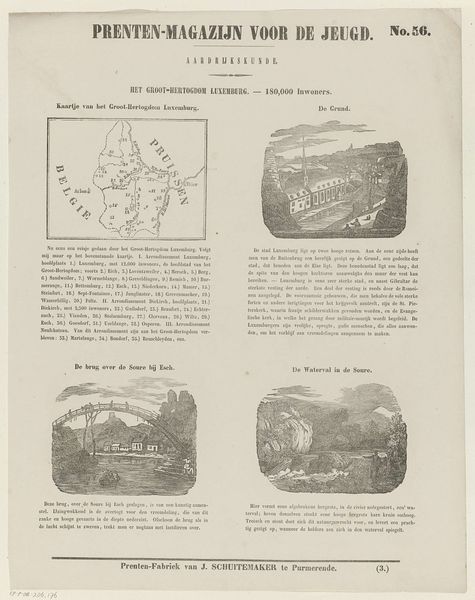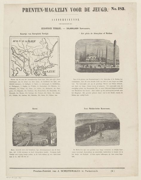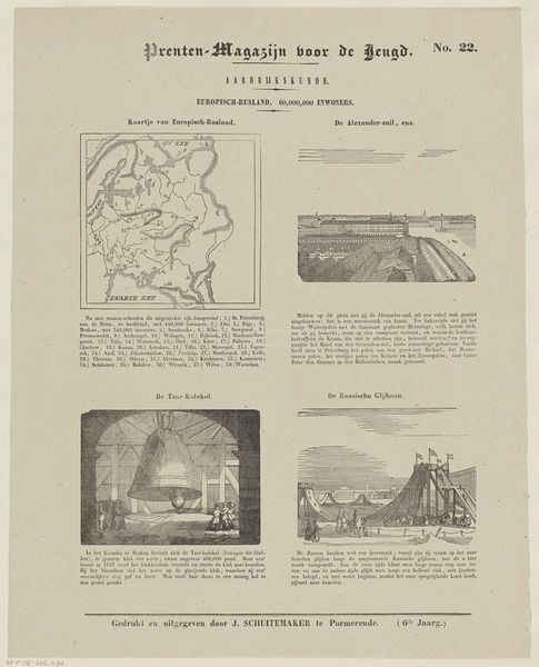 This is a page from "Prenten-Magazijn voor de Jeugd," or "Print Magazine for Youth," No. 136, by Jan Schuitemaker, titled "Europisch-Rusland. 60,000,000 Inwoners" or "European Russia. 60,000,000 Inhabitants.” Produced as part of a series for young people, it reflects the 19th-century European fascination with Russia, framing it as a land of immense size, population and intriguing monuments. The page presents Russia through a set of images and text, which includes a map, an architectural monument, a giant bell, and a slide. The images and descriptions offered here exoticize the culture, turning Russia into a spectacle for consumption. It invites viewers to marvel at the grandeur and otherness of a world distant from their own, reinforcing a dynamic of looking and knowing which positions Europe as the center of the world.