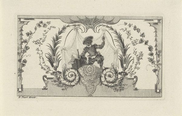 Bernard Picart created this print, "Vignet met jongen die voor een dame fluitspeelt in landschap," sometime between 1673 and 1733, using the technique of etching. The fineness of the lines speaks to the artist's mastery of this demanding process. To make an etching, a metal plate, usually copper, is coated with a waxy ground. The artist then scratches an image into the ground with a needle, exposing the metal. The plate is immersed in acid, which bites into the exposed lines, creating grooves. Ink is then applied to the plate, filling the grooves, and the surface is wiped clean. Finally, the plate is pressed onto paper, transferring the ink and creating the print. Looking closely, you can see the etched lines that define the figures and landscape. Note the contrast between the delicate, controlled lines of the figures and the looser, more atmospheric lines of the background. The amount of work involved in creating this level of detail is considerable, reflecting the value placed on skilled craftsmanship in the 18th century. This etching invites us to appreciate the artistry and labor involved in printmaking, reminding us that even seemingly simple images are the result of complex processes and skilled hands.