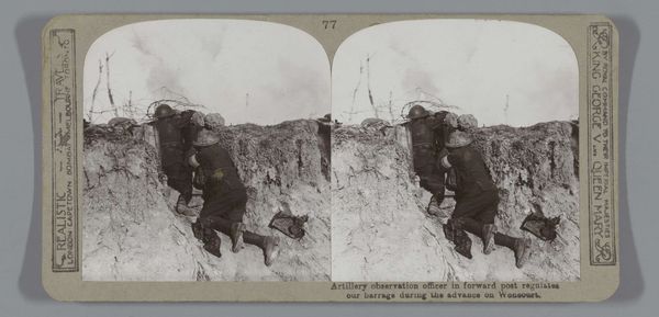 This stereoscopic image, made by Realistic Travels, captures the aftermath of artillery fire on a Hun blockhouse. The approach here is documentary, but there's something unreal about the duplication of the scene. It's like a photograph, but doubled, inviting a kind of visual stutter. The grayscale palette reinforces the bleakness. Look at the smoke—it's suspended, frozen in time, almost like a ghostly presence. The texture of the earth, the rough-hewn construction of the blockhouse, all rendered in shades of gray, create a palpable sense of destruction. The photograph is like a sketch, or an unfinished painting, inviting the viewer to fill in the emotional details. I am reminded of Gerhard Richter's blurry, gray paintings of war, which use a similar palette and soft focus to evoke the trauma of violence, suggesting that war is a kind of hallucination. Ultimately, art, like war, is an ongoing conversation about what it means to be human.