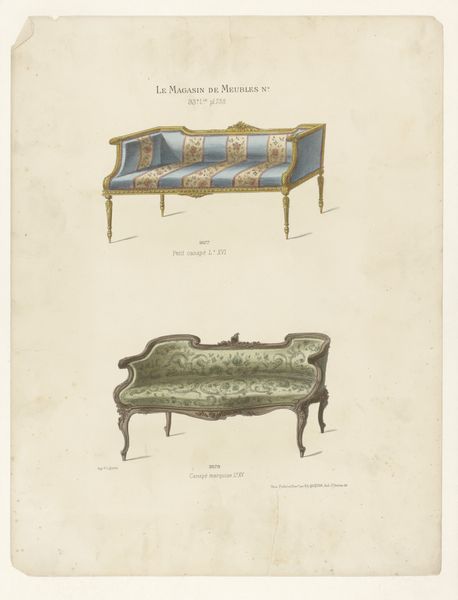 This print by Léon Laroche depicts furniture designs, a canapé, armchair, and chair, all in the Louis XVI style. The print reveals the workings of the 19th-century design industry in France. The phrase "L'Ameublement Collection Simple" suggests the print was part of a larger series of design ideas, intended to be accessible and easily reproduced, and that it was published to be widely distributed. In fact, it was published by Vve Magimel, a printing and publishing company with an office in Paris. The print's existence speaks to a growing market for accessible design ideas. The Louis XVI style, popular among the French aristocracy before the Revolution, was here being democratized and commercialized. Such a design could be a starting point for further research, using trade publications and manufacturer's catalogs to get a sense of popular taste in furniture in Paris at the time.