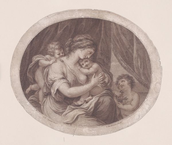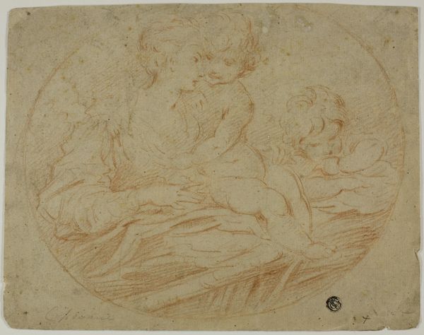 Curator: Looking at this tender scene, what strikes you most immediately? Editor: The vulnerability, definitely. The exposed breast, the unguarded poses of the children—there's an almost unsettling intimacy despite the classical subject matter. Curator: Absolutely. We're looking at a work titled "The Madonna with the Christ Child, with the infant John the Baptist and another Child" by Abraham Bloemaert, likely created between 1595 and 1605. What’s fascinating is the use of materials; this drawing in pencil offers us insight into the labor involved, it's not grand pronouncements, but skilled work that resulted in this image of grace. Editor: And there’s something decidedly unfussy in Bloemaert’s technique, particularly if you consider that we are meant to venerate Mary, her representation resists glorification in favor of tenderness. Is that deliberate? Curator: Bloemaert was deeply involved in exploring Counter-Reformation themes, he’s exploring motherhood as a vehicle for empathy and spiritual connection; his interest wasn't merely surface-level aesthetics but aimed at engaging viewers on a personal, emotional level. He's showing her nurturing physically in this intersectional approach to motherhood and the divine. Editor: Thinking about the social context and religious mandate, it feels significant to notice the raw process on display, with these subtle pencil marks—drawing as devotional act and product of workshop activity, merging the sacred and the secular. It's a piece that reflects the means and conditions under which it was made. Curator: It's a valuable reminder to look beyond just the religious subject and explore what art and faith truly meant to people navigating historical currents and labor relations. Editor: Precisely. The drawing’s physical existence—the labor, the medium—offers a new viewpoint beyond idealized Madonnas; it gives space to lived experience through which meaning takes shape in our world. Curator: I see it also through that prism: to see it as Bloemaert positioning this idealization inside real life—not excluding difficult and real circumstances surrounding it. Editor: I agree. This exploration into Bloemaert's creative practice and our discussion highlights how both process and representation carry significant weight. Thank you for this insight. Curator: A meaningful intersection, and thank you too.