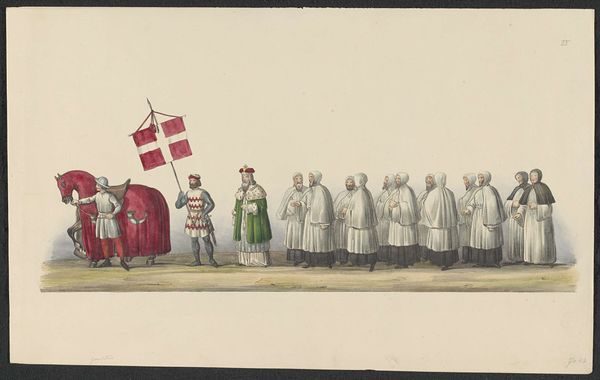 Curator: Let’s discuss this 1841 watercolor drawing, "Gekostumeerde optocht van 1841: ridders (blad V)", now residing at the Rijksmuseum. It's attributed to an anonymous artist. Editor: My first thought is a delightful blend of seriousness and absurdity. The knights on horseback, especially the ones draped in checkerboard patterns, are simply begging for interpretation! Curator: Precisely! Notice the composition – the frieze-like arrangement of figures. The artist carefully balances the clusters of figures to maintain a rhythm across the picture plane. Editor: Absolutely, it has this narrative procession that taps into our enduring fascination with medieval pageantry, and that juxtaposition of solemnity and playfulness speaks volumes about cultural memory and perhaps even social commentary. Curator: Observe the artist's choice to utilize watercolour and drawing—these lend an air of delicacy to the overall representation. How does the rendering of textures inform your reading? Editor: Texture wise, that creamy wash on the knights' white surcoats stands in stark contrast to the bold patterning beneath and the figures at left: four men standing, but in similar dark robes and a completely different configuration of shapes that still speaks volumes of medieval representation through simple clothing and presentation. It's more like visual codes co-existing. Curator: A fruitful interpretation. Do you see a purposeful deployment of hue? Editor: Color is certainly intriguing. The muted palette, especially those pastels on the horses, lends this image a sense of theatrical unreality. I'm interested in what symbols remain from our knowledge of classic and medieval artistic presentations. Are we supposed to compare these modern recreations against their artistic influences? Curator: One cannot overlook the symbolic weight invested in their apparel, hinting at aspirations towards an antiquated social order. Also observe how lines and geometry are the building blocks here to represent how individuals understand an idyllic Medieval past that might not reflect reality. Editor: And what of the little figure between the last two riders and horses? All in blues and the last rider bearing a golden lion in flag, with yellow and black stripes. Are they supposed to look…jolly? Or like real individuals on the canvas of history? Curator: Indeed, and it brings an undercurrent of lighthearted charm to a drawing steeped in historic reference and painterly academic tradition. It showcases a very delicate approach, the kind that academic works don’t readily exhibit. Editor: I’ve never thought of formal constraints providing more artistic possibilities, so thank you for that novel presentation. It has been rather fascinating examining this artistic tightrope between symbolism, societal critique and its commitment to compositional clarity.