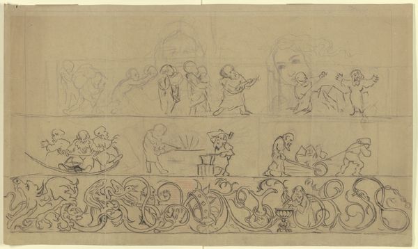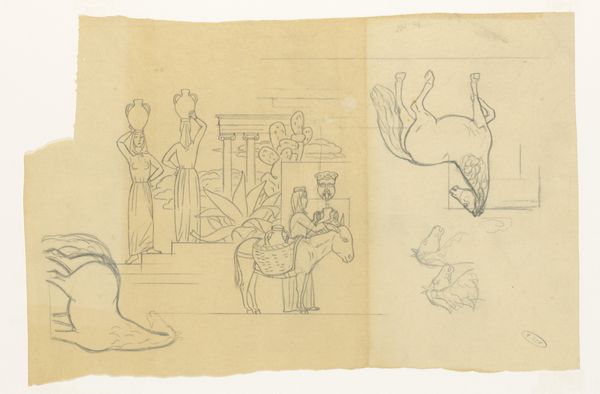 Curator: Looking at "Oosterse goden en figuren," created between 1841 and 1858 by Andries Wiemans Cz., I’m immediately drawn to its ethereal quality. It's a pencil drawing on paper, depicting three distinct narrative scenes, almost like a storyboard from another world. Editor: It's undeniably gentle, isn’t it? The faint lines, the suggestion rather than stark declaration… it's like peeking into someone's dream journal. I wonder what narratives were swirling around at the time to inspire these fantastical images. Curator: Well, during this period, there was increasing Western fascination with the "Orient," often filtered through colonial perspectives, of course. Wiemans seems to be exploring this exotic imagery, likely based on second-hand accounts or existing artistic tropes rather than direct experience. You can see the influence of popular illustrations in travelogues or ethnographic studies. Editor: You're right. There's a detached curiosity here, not an insider's perspective. But isn't it interesting how this imagined “Orient” becomes a canvas for exploring the artist's own sensibilities? It's all a projection, isn't it? These gods and figures almost float, unburdened by earthly weight, which could suggest a critique, intentional or not, of the heavy-handed portrayals common in colonial depictions. Curator: It's a layered viewing experience, isn't it? We have these figures depicted, probably derived from existing stereotypes, presented with almost whimsical execution, giving it all an element of commentary through composition and style. Editor: Precisely. This quiet rebellion…it draws me in more than any bold statement ever could. It really goes to show that even in apparent artistic mimicry, the heart of the artist might express itself with utmost honesty, even if unknowingly. Curator: The drawing becomes more than just a reflection of external fascination. It mirrors the internal workings of the artist, his hesitations, questions, perhaps even his own unwitting biases, presented to us through these delicate depictions. Editor: Yes! I think I like this unassuming sketch more each minute. There's such value in the space it gives to interpretation, and its soft execution becomes disarming and charmingly self-aware. Curator: I couldn't agree more. This seemingly simple sketch contains such a trove of stories, interpretations, and a window into a very specific, complex moment in history and the creative mind of its creator.
