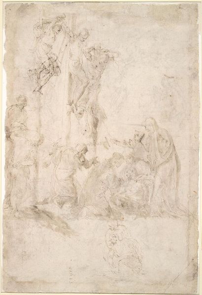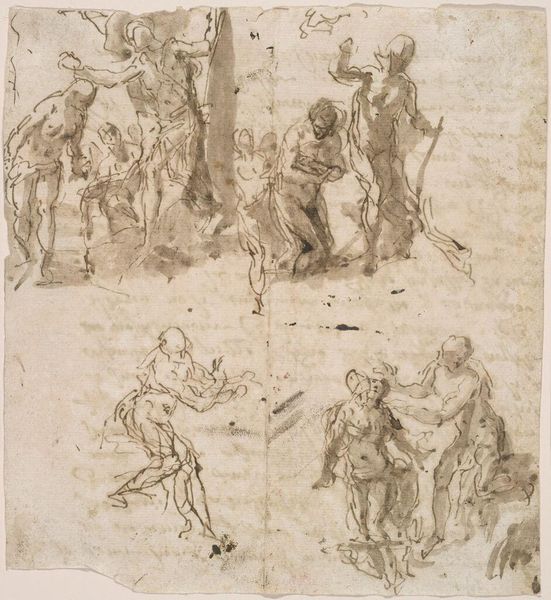 Editor: This is Amico Aspertini's "Myth of Diana and Actaeon," a drawing from around the early 16th century. The monochromatic rendering creates a hazy, dreamlike quality, but the composition seems quite dynamic. What strikes you most about this piece? Curator: The dynamism arises precisely from Aspertini’s exploitation of line. Note how the figures, though lightly sketched, possess a powerful torsion. The artist orchestrates a visual rhythm that enlivens the entire sheet. Do you see how the composition directs the eye? Editor: Yes, the figures do seem to be actively moving and the lines create a circular flow within the rectangular frame. It almost feels like a whirlwind captured on paper! Curator: Precisely. Aspertini masterfully uses formal elements to evoke a sense of kinetic energy, transforming a mythological scene into a study of pure, restless form. It is a testament to the expressive power of line itself. Editor: That's a new perspective, I'll have to keep a closer eye on lines from now on. Curator: Indeed, sometimes the most fundamental elements are the most revealing.