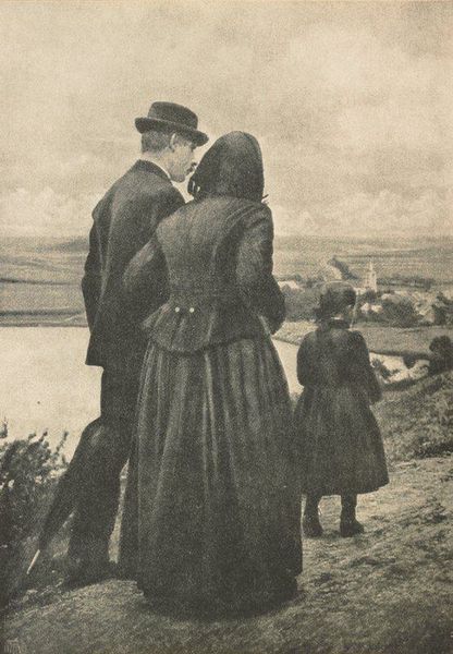 Curator: Alfred Stieglitz captured this gelatin-silver print, possibly between 1894 and 1895, titled "Hour of Prayer." Editor: There’s such a stillness to this. Despite the overcast sky, there's something comforting about the composition, almost like a memory fading in sepia tones. Curator: That "fading" is significant. Stieglitz was deeply embedded in the Pictorialist movement, emphasizing the artist's manipulation of the photographic process to achieve painterly effects. He blurred lines – literally and figuratively – between photography and traditional fine arts. Editor: The texture of that sand intrigues me, the way the tracks run through it and how they imply labor but lead to prayer. Was this about documenting the realities of these women's lives, their physical toil set against the promise of spiritual respite? Curator: It absolutely resonates with that duality. The two women are the subject, aren't they? I mean, yes, that church is in the background, a solid monument in this composition, but their work informs everything around them, the culture itself. Their presence makes that monument possible. How are they situated, both physically on that shore and within the broader narratives of turn-of-the-century labor, faith, and the quiet strength of women? Editor: And think about gelatin-silver printing, that technique he's employing. It suggests precision, control, but the tones achieve that soft, almost hazy quality. This isn't just a 'snapshot'; it is crafted and, as you point out, carefully manipulated. The medium isn't invisible; the technique informs everything we are talking about. Curator: Exactly. What visual language is he using to depict these women as pious figures in their landscape, especially juxtaposed with industrializing world of 19th-century Europe? Is Stieglitz acknowledging the invisible labor of women who sustain faith and family, grounding the foundations of society with quiet but undeniable force? Editor: I suppose if we return to where we started, with this overall stillness, this feels not like resignation but deep resolve. Curator: An unwavering presence. It reframes who constitutes "greatness" within the human experience. Editor: Beautifully put. Thank you for sharing this. It makes you look beyond that first impression and deep into a broader understanding.