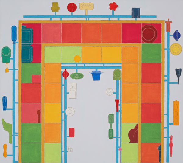 Alfio Giuffrida made TORE Exp7 with paint, and I love how the brushstrokes make a grid of layered color. The paint is opaque, but it almost feels thin, so the process becomes clear and present. The arrangement of objects reminds me of a kitchen, but the objects themselves are ambiguous. Some are easily identifiable: bowls, spoons, bottles, but others seem like geometric shapes. The objects hang on the grid, like a flat, frontal still life. The color palette is really interesting, the contrast between the light background and the primary colors, like the red circle in the upper right quadrant, creates a sense of playfulness. Giuffrida's work shares a formal resemblance to Giorgio Morandi's still life paintings, but there is also a really contemporary spirit. The overall feeling is one of openness and experimentation. The painting invites a lot of interpretations, and to me that is its strength.