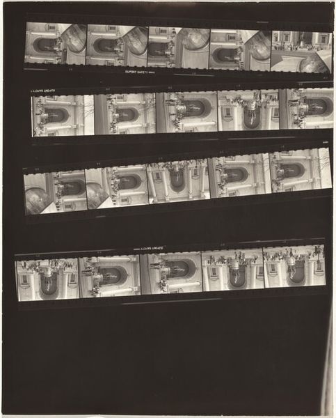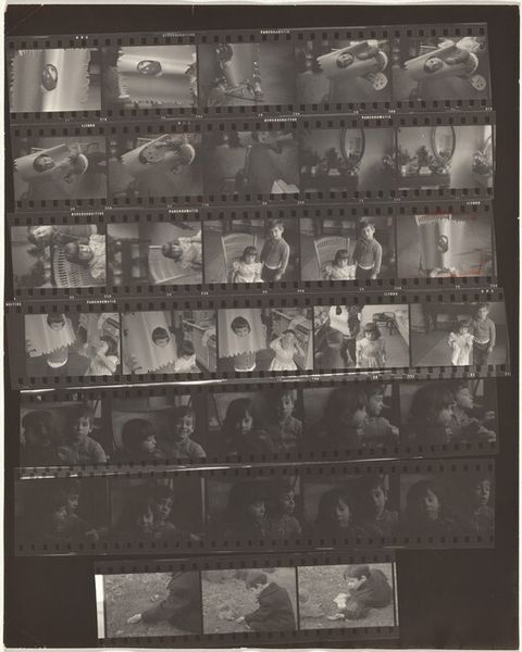 Editor: This is a gelatin silver print by Robert Frank from 1962 titled “Franz Kline no number”. It’s a contact sheet, showing multiple shots of, I assume, Franz Kline in his studio or room with one of his paintings. It feels very intimate, almost voyeuristic. How would you interpret this piece? Curator: This work intrigues me from a formalist perspective. Consider the stark contrasts in light and shadow within each frame, and how these elements repeat across the entire contact sheet. The repetition creates a visual rhythm, doesn't it? And notice how the artist’s choice of a contact sheet, a typically utilitarian object, elevates the process of documentation itself to an artistic statement. What do you observe in the use of line and form within Kline’s painting as seen in these shots? Editor: Well, the harsh lines of the painting almost mirror the sharp, defined edges of the contact sheet, or maybe the room itself. It makes the whole image feel very rigid, structured. It contrasts with the implied candid nature of the photos. Curator: Precisely. Frank is forcing us to consider the structural elements inherent in both the creation of the painting and its photographic record. Do you perceive any thematic relationship between Kline’s abstract expressionist work and Frank's photographic approach? Editor: Maybe a shared interest in capturing raw emotion and energy? Both are seemingly unedited, immediate. But I see what you mean. Even with Kline, known for his expressive brushwork, the lines are always balanced within the composition, which goes with Frank's contact sheets. Curator: Precisely. It demonstrates the powerful connection between artistic mediums and the structure or pattern that informs aesthetic styles and movements, as seen within Abstract Expressionism and street photography. Editor: That's insightful. I never really considered how much the form could influence how we read content in Frank's work. Thanks for highlighting that. Curator: My pleasure. These structural echoes are essential to understand how meaning is produced through a work of art.
