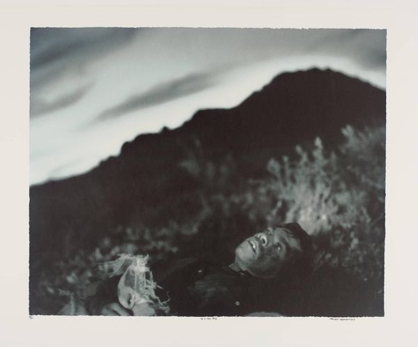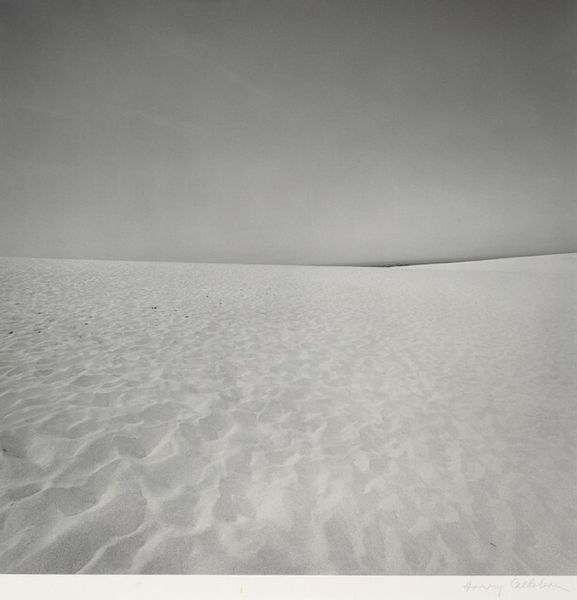 Curator: Koichiro Kurita's photograph, "Dusk Dune," presents a stark landscape. Its dimensions are roughly 40 by 50 centimeters. Editor: The photograph's high contrast really grabs me. The looming shadow dominates the composition, almost eclipsing the dune itself. Curator: Shadows are potent symbols. This darkness can be read as oblivion, a space of unknowing, or perhaps a protective enclosure before rebirth. Editor: I wonder what process Kurita employed? The tones are so rich and the texture is remarkable, like tactile sediment. The material itself contributes to the mood. Curator: The emptiness of the dune and sky certainly evokes a meditative state, a symbol of the self stripped bare. Editor: Perhaps. Or maybe it's a study in photographic craft, the beauty emerging from skillful manipulation of light and matter. Curator: That's valid. For me, this speaks to something deeper. Editor: Interesting! I’ll think about that.