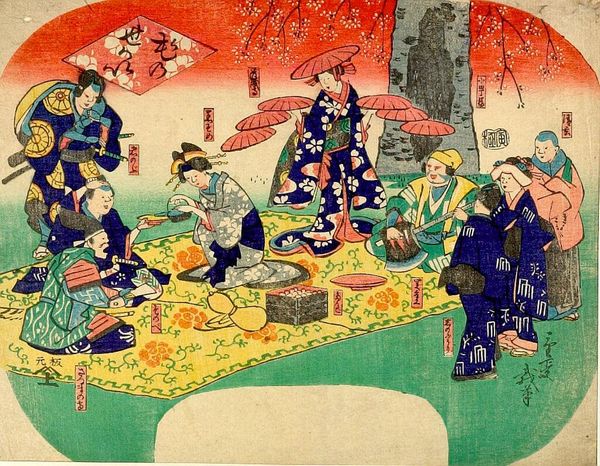 Editor: This is Utagawa Hiroshige's "Vendors at Onkyokuchō," and it’s a bustling market scene. I am struck by how dynamic this print feels. What symbols or meanings resonate with you in this image? Curator: Notice how Hiroshige uses the fan shape itself as a symbol of openness, inviting us into this sensory experience. The arrangement of vendors and customers, their clothing, even the goods they are selling—each detail evokes the vibrancy and ephemerality of daily life in Edo-period Japan. Consider the lantern makers; lanterns themselves often symbolize guidance or enlightenment in many cultures. What do you make of their prominent placement here? Editor: That's interesting; I didn't think about the lantern makers. So, it seems that this work is less about the objects being sold and more about the experience and cultural values associated with the market? Curator: Precisely. The act of vending is a very human endeavor that reflects the cultural priorities of a society at a specific moment in time. It's like a coded message left for us to decipher. Editor: It's fascinating to consider the market as a cultural symbol itself. Thank you for the insight.