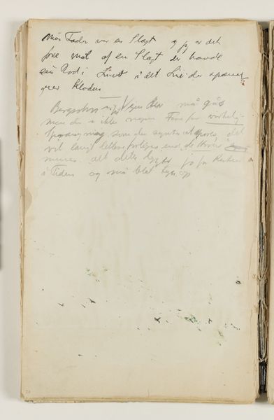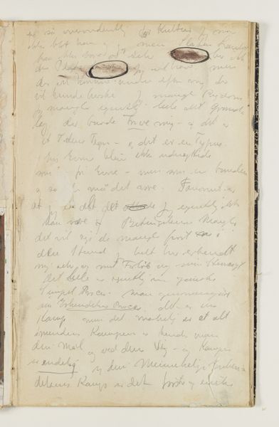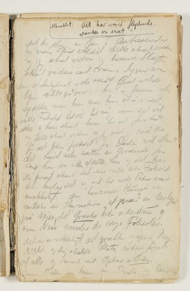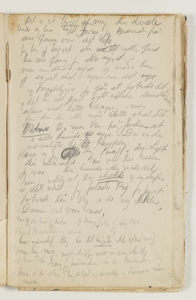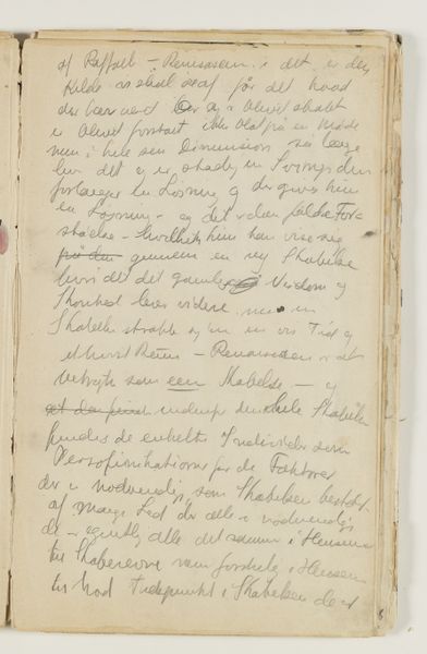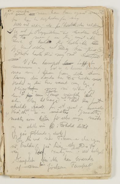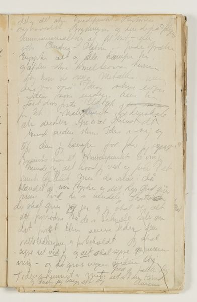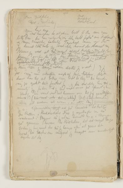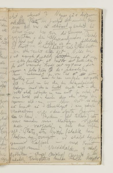 Curator: Right now, we're standing in front of J.A. Jerichau’s "Notater," created between 1913 and 1914. It's currently held at the SMK, the Statens Museum for Kunst. The piece combines drawing, ink, colored pencil, pen, and watercolors on paper. What strikes you immediately about this densely inscribed page? Editor: It feels intimate, almost voyeuristic, like stumbling upon a deeply personal journal left open. The script dances across the page, a flurry of thoughts captured mid-flight. Curator: Absolutely. Jerichau, with his North-Renaissance leanings, he understood how power dynamics impact what art gets produced. So here’s a raw, uncensored expression, a rebellion against polished artistic convention, wouldn't you say? Editor: I do, yet I sense a yearning, too. Despite the apparent spontaneity, there's a deliberate hand at work. The choice of materials, the composition… It's controlled chaos. Do you think this has been transcribed, then maybe destroyed, and later it became the whole point of the exercise? Curator: The use of layered mediums – pen, ink, watercolor – adds a visual texture that really echoes the complexity of thought itself. I find that the writing moves between confident pronouncements and hesitant queries... Almost battling it out, line after line. Editor: True, and it's tempting to try and decipher it all, to uncover hidden meanings, the personal. The Historian in me can see the journal itself became a piece of artwork, not just a keeper of them, for an artistic mind such as Jerichau's! It’s fascinating how art making transforms what he looks at, too. Curator: So much here feels provisional and fleeting. Maybe that's why it resonates so strongly; it's a tangible record of a mind grappling with something just beyond reach, perhaps not even knowing it needed resolution. Editor: Yes. Art gives us such insights in that space between thought and solid knowledge. The mind's dance on the paper! Thank you for opening up those windows for me today.