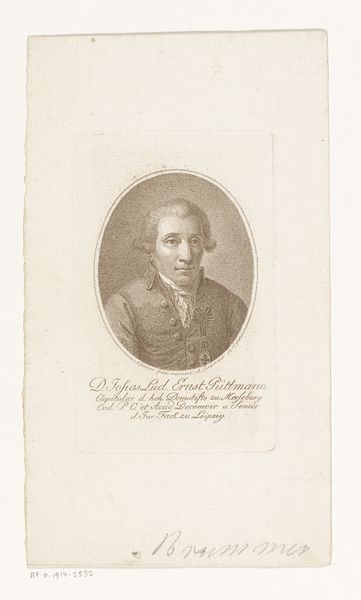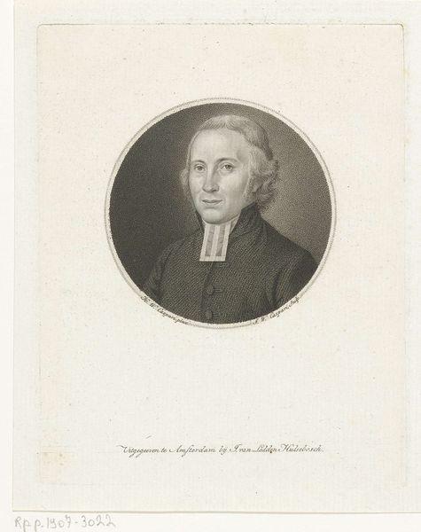 Curator: So, we’re looking at "Portret van Johannes Cristianus Vorstman," a print from somewhere between 1784 and 1822 by Jacob Ernst Marcus. It's held here at the Rijksmuseum. Editor: He has kind of a weary air, don't you think? A world-worn intellectual peering out from that oval frame. Is it just me, or does the gray, somber mood just suck all the color right out of the room? Curator: Well, hold on. It is an engraving, so the tonal range is inherently limited, guiding the eye. Notice how the precision in the hatching defines Vorstman's features. See the subtle textures achieved? How the controlled lines model the fall of light on his face, creating this strong sense of three-dimensionality? It really encapsulates the Neoclassical interest in clarity. Editor: Clarity, yes, but doesn’t it also feel like clarity bordering on… I don't know… flat? There's a weight here, almost a somber formality. It makes me wonder what his story was, what shadows lived behind those eyes. History painting with a twist of melancholy perhaps? Curator: Perhaps the clothing adds to that somber note. But the man… yes, his pose is rigid, in keeping with portraiture of the time. His clerical collar tells us something, and it’s there amidst the composition, which is an ode to simplicity. And don’t you see something appealing about this old engraving style? Editor: Definitely, I guess it's about the beauty in that kind of somber historical snapshot that's now gazing back at me, it is very haunting, as a portal to the past it works, no question. Curator: And perhaps it can remind us that every line, every shade in a work of art, whispers a story, however quietly. Editor: Agreed. You've certainly nudged me to reconsider its muted palette and linear precision, because indeed, in their careful rendering, there may well be whispers waiting to be heard.