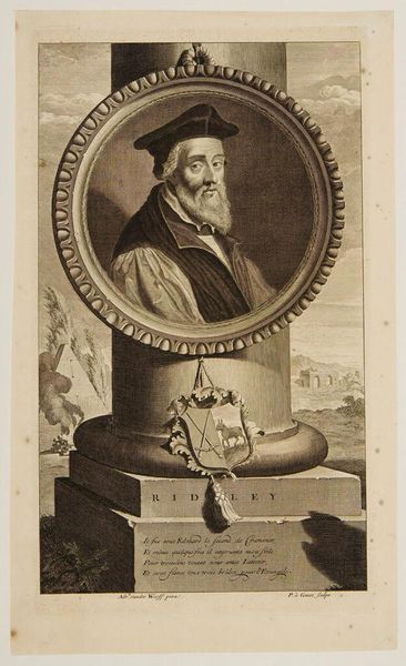 Editor: This portrait of Hugh Latimer, Bishop of Worcester, is by Pieter van Gunst, though it doesn't have a specific date. I’m struck by how severe and somber it feels. What do you see in this piece? Curator: It whispers to me of resilience. Latimer was burned at the stake for his beliefs! Notice the laurel wreath – a symbol of martyrdom here, intertwined with the stark reality of the pyre depicted below. The poem reminds us of his sacrifice, as though he is a martyr or a saint. What do you make of that? Editor: The contrast makes the portrait more thought-provoking. Thank you! Curator: And thank you for noticing the nuances. It is, after all, about faith, sacrifice, and unwavering spirit.
