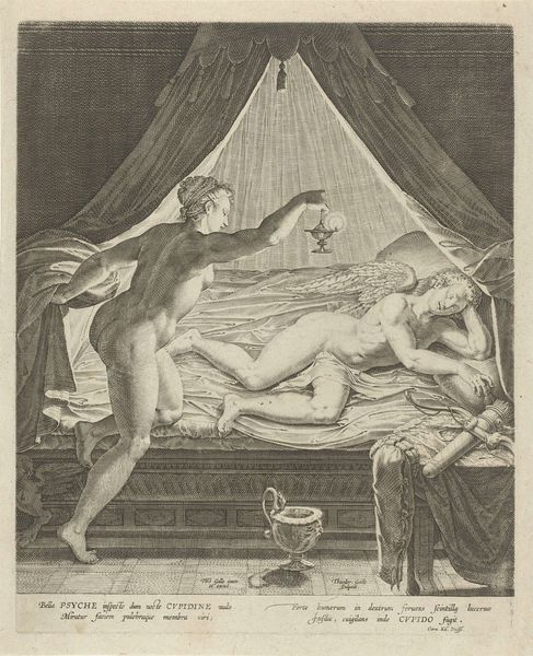 Curator: Before us is Orazio Borgianni's "Isaak belooft Esau een tweede zegening," or "Isaac Promises Esau a Second Blessing," an engraving created around 1615, housed right here at the Rijksmuseum. Editor: My initial impression is a scene of dramatic tension, yet rendered with a delicate linearity. The artist emphasizes contrasts, and the figures have that stark light characteristic of the baroque. Curator: Indeed. Borgianni captures a pivotal biblical narrative here. Blind Isaac, misled, mistakenly blessed his younger son Jacob. Esau, returning from the hunt, seeks a second blessing. What emotions resonate for you? Editor: There is an unmistakable sense of anguish in Esau's stance – a physical recoil paired with extended arms. The composition itself, with Isaac enthroned on the bed as if on an altar, elevates the scene to something more significant than a simple domestic drama. The shadow cast on the ground also looks remarkably ominous. Curator: Exactly. That shadow plays into the broader symbolic context. Isaac embodies fading authority; the blessing, cultural legitimacy being bartered. Note Esau's body – he seems almost exposed as if the garments could symbolize not being "clothed" with blessings or status. It is intriguing, and rather sad. Editor: And see how the lines are both descriptive and expressive? They create both form and evoke emotion. Consider the treatment of drapery versus the stark, more definitive lines that define Esau's torso and face. It reinforces that physical and emotional rawness. Curator: The beauty of this work lies in its ability to weave a personal and political saga. Isaac’s failure, Esau's frustration and later his perceived loss; it touches on themes still echoing today: legacy, deception, the human condition in all its beautiful imperfection. Editor: The longer one looks, the more those lines reveal depth. Beyond depicting the scene, it evokes something unsettling in its very construction, like the threads of narrative, ethics, and history unravelling simultaneously before us. It's brilliant.