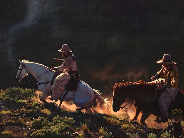 Mark Maggiori’s "Moonlight Solitaire" captures a lone cowboy on horseback under the ethereal glow of the moon. The moon, a timeless symbol, speaks of cyclical time, of changing phases that have long echoed human emotions and the subconscious. Consider the figure of the horseman, a motif that reappears across cultures, from classical equestrian statues to the knights of medieval lore. Here, under the vast, illuminated sky, he is a solitary figure, evoking themes of independence, introspection, and perhaps even a touch of melancholy. The emotional resonance of the image lies in its ability to tap into our collective memory of adventure and solitude. Just as the moon waxes and wanes, so too does the meaning of this ancient symbol, continually resurfacing in art, adapting, and reflecting our ever-evolving understanding of the human condition.