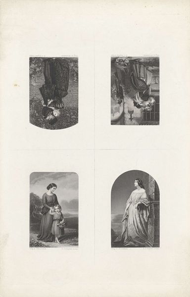 Editor: This is a drawing entitled “Herder en herderin - Meisje met kittens - Grootmoeder vertelt - Maria aan de voet van het kruis,” made by Dirk Jurriaan Sluyter between 1842 and 1873, using graphite. There are actually four images on the page, each with a distinct narrative feel, but rendered in delicate pencil strokes. What stories or symbols do you see woven into this quartet? Curator: Ah, an intriguing assembly! It's more than just a collection of scenes; it's a carefully constructed arrangement. Notice how each panel utilizes different framing, different techniques? Each one speaks to very specific visual traditions, so let's unpack a few. That top-left panel, the shepherd and shepherdess. Where have we seen such poses and idyllic imagery before? Editor: It makes me think of classical pastoral scenes... you know, scenes representing an idealized, rural landscape? Curator: Exactly! And in direct opposition, you have Mary at the foot of the cross. We have gone from pagan idyllic to a Christian scene. Observe her posture and the soft curves versus sharp angles which speak of sacrifice, a direct symbol from Christian stories, or icons. Now look at how Sluyter uses domestic scenes of family closeness as something parallel, or even equal, to those historic ones. Is he inviting us to rethink the sacred? Editor: So it’s a conversation between different kinds of stories... It is playing with themes of love, sacrifice and... daily life? It almost gives everyday life a sacred quality by placing them next to those Biblical and Classical scenes. Curator: Precisely. By putting these next to each other, do we think more or less of either story? Are the images connected by any repeating formal elements? Do they amplify each other, or comment ironically? I'd suggest keeping those questions in mind as you look around this room... and the world. Editor: That's given me so much to consider, really appreciate this perspective, thank you.