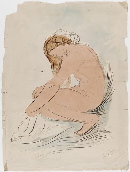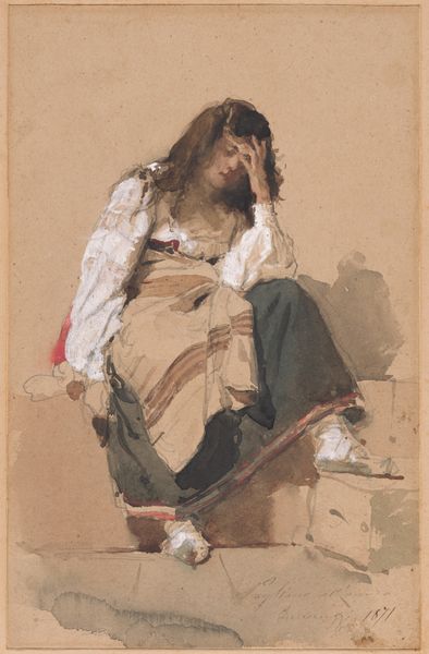Willem Witsen rendered this watercolor drawing of a seated girl surrounded by military props, with no date specified. The juxtaposition of innocence and martial symbolism creates a striking visual tension. Note the details: the ballet attire, the forlorn expression of the girl, and her clasped hands supporting her face. Her posture speaks to a universal posture of melancholy. Consider the inclusion of the sword and drum as symbols of war and power. We are reminded of Jacques-Louis David's 'Oath of the Horatii' from 1784, where gestures similarly convey intense emotional states. This tension between childhood and militarism can be found in other contexts throughout history, reflecting a deeper, perhaps subconscious, unease with the encroachment of conflict on innocence. The image, therefore, is a visual paradox. It speaks to the complex interplay between fragility and strength, and between the world of play and the looming specter of conflict. This cyclical progression invites contemplation, resonating across generations.