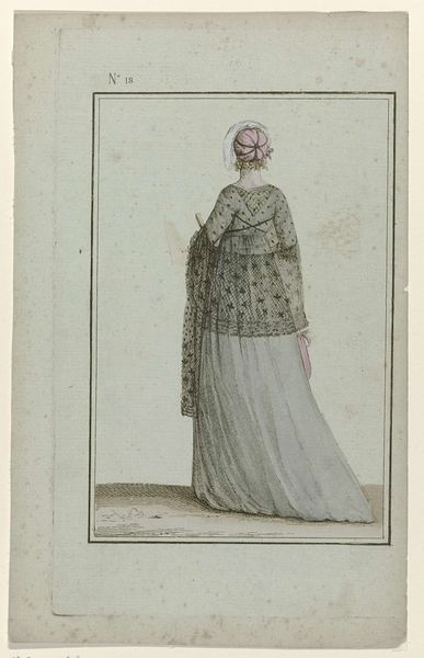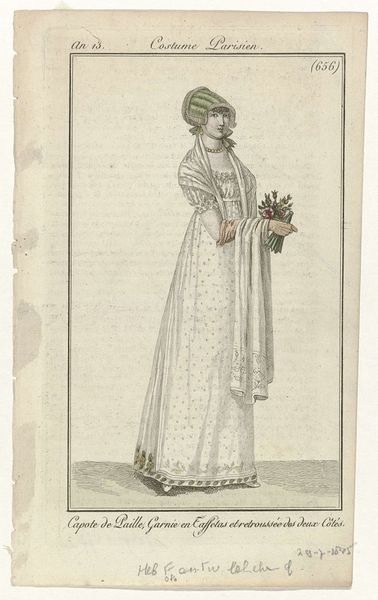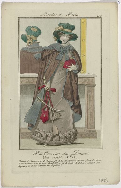 This fashion plate from 1825, titled "Petit Courrier des Dames," offers a glimpse into the sartorial expectations of women in post-revolutionary France. The image, likely a print from a fashion magazine, presents an ideal of feminine elegance. The focus is a full-length gown trimmed with fur, its design reflective of the era's emphasis on slender silhouettes and ornate details. The gown speaks to the rigid class structures of the time, suggesting the wealth and status of its intended wearer. Fashion was a tool that women in high society could use to reinforce existing gender and class hierarchies. Yet, in an era of shifting political landscapes, the gown may also have served to empower the wearer by demonstrating her taste and affluence. The woman’s posture and expression convey a sense of restrained poise, embodying the era’s ideals of femininity. The artwork prompts us to consider how fashion, identity, and social standing intersect.