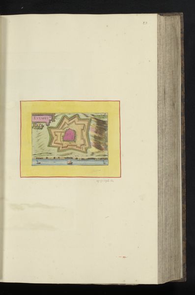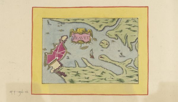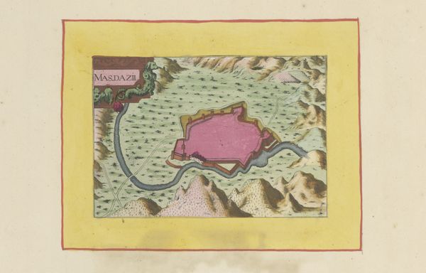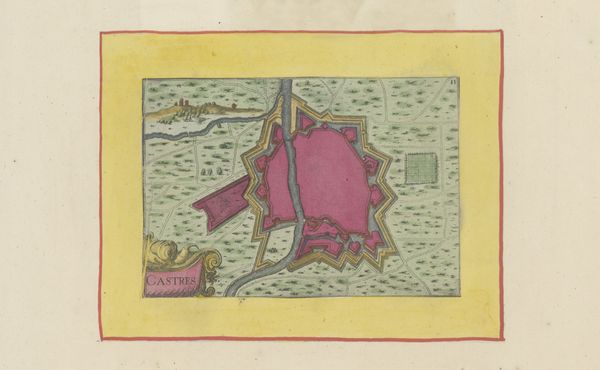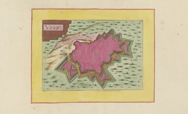 This anonymous map, titled ‘Gezicht op Anduze,’ was made using a combination of engraving and hand-coloring. The process begins with an engraver using specialized tools to carve lines into a metal plate, which is then inked and printed onto paper. What sets this map apart is the addition of color, applied by hand, probably by trained artisans. Note the pink fortifications, the carefully distinguished agricultural fields, and the yellow border that gives the image its frame. This division of labor—the engraver creating the base image, and the colorist adding vibrancy—speaks volumes about the economics of mapmaking at this time. It suggests a workshop setting, with individuals specializing in different tasks to efficiently produce these detailed views. The careful, consistent application of color also indicates that the map wasn’t just a utilitarian object, but one intended for display and appreciation.