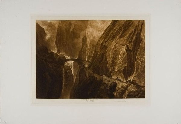 Editor: This is Frank Short's "Swiss Bridge, Mont St. Gothard (Via Mala)." The sepia tones give it a rather brooding, almost oppressive atmosphere. What does this image communicate to you? Curator: The "Via Mala," or bad road, speaks to the historical subjugation of nature. This print prompts questions about who built this road and bridge, who benefited, and who suffered during its construction and use. Whose labor is unseen in this romantic vision? Editor: So, it's not just a pretty picture of a bridge? Curator: Precisely. It's a document, a representation that invites us to consider power dynamics inherent in landscape and infrastructure. It makes me wonder about environmental impact, too. Editor: I see. It's definitely made me think about it differently. Curator: Hopefully, it will inspire similar questioning from our listeners.