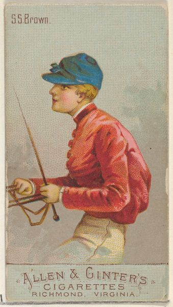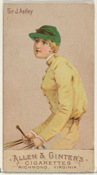 Editor: This is "Count W. Kaunitz, from the Racing Colors of the World series," made around 1888 by Allen & Ginter. It's a colored pencil drawing, part of a print series that feels a bit like an early form of trading cards. I’m immediately struck by the slightly humorous tone. It's a portrait, but almost a caricature. What's your take? Curator: It's wonderfully whimsical, isn’t it? To me, it’s a little window into the Gilded Age’s obsession with all things worldly and fashionable. Cigarette cards were a curious phenomenon; collectible, tradeable, and oddly educational! Look at how the artist has captured the Count’s racing silks – do you notice the level of detail, almost a photographic precision applied to something so ephemeral? It’s an interesting contrast, wouldn't you agree? Editor: I see what you mean! It’s funny to think of a cigarette company documenting “Racing Colors of the World.” It makes the racing world feel almost…commercialized, even back then? I also notice how he doesn't exactly emanate confidence! Is that meant to suggest something about this particular count? Curator: Perhaps! Or perhaps it speaks to a wider commentary on status and image. Think about it - were these images meant to inform, or were they really meant to sell an aspiration? To buy into a world of perceived luxury and international glamour. In this light, would it even matter if the sitter looked less-than-princely? It gives me pause… Editor: Wow, that’s fascinating – reframing it as selling an aspiration, not just showing off the “Racing Colors.” It really does change how you read the image. Curator: Exactly. What began as a seemingly innocent portrait suddenly feels layered with cultural and economic nuances. It is why history of art keeps me perpetually captivated and challenged, hoping, with you, to explore these perspectives. Editor: That's given me a lot to consider! I definitely see more to this little portrait card than I initially thought. Curator: Me too! Another card checked off my ever growing to-examine stack! Thanks for joining me on this artistic jaunt!