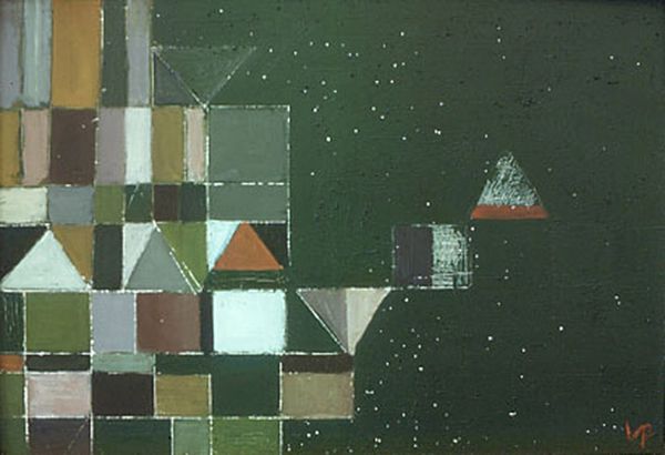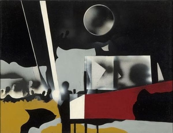 Editor: Endre Balint's "Vision at Rouen," created in 1961 using acrylic paint, strikes me as incredibly dreamlike, almost unsettling. The forms feel both familiar and alien. What do you see in this piece, and how do you interpret it? Curator: This painting, to me, is deeply rooted in the sociopolitical anxieties of the post-war era. Look at how the geometric shapes clash against each other, creating a sense of unease. Do you see the disjointed human figure and fragmented architectural elements? They reflect the fractured sense of identity and displacement prevalent in the wake of global conflict. Editor: I hadn't thought of it that way. I was focusing more on the artistic style, that’s interesting. Curator: And let’s consider the title, "Vision at Rouen." Rouen, a city with a rich but also turbulent history, became a focal point during the war. Balint may be referencing the shattered remnants of both personal and collective memory, asking us to confront a difficult past in order to build a more conscious future. How does this revised lens resonate with you now? Editor: I think that definitely shifts my perspective on the piece. It makes me see the abstraction less as arbitrary and more as a deliberate commentary on the fragmentation of society and experience. The dark background almost feels like a stage. Curator: Exactly! By grappling with such topics, Balint implicates us, the viewers, in an active dialogue around identity, memory, and the responsibility we have to interpret and shape history. What lessons could this historical context share with modern sociopolitical views? Editor: I never considered art’s conversation about historical traumas and it makes me consider how art impacts society today. Curator: That’s exactly what makes this piece so compelling and relevant! It offers a critical reflection on the past, prompting us to examine its impact on our present.