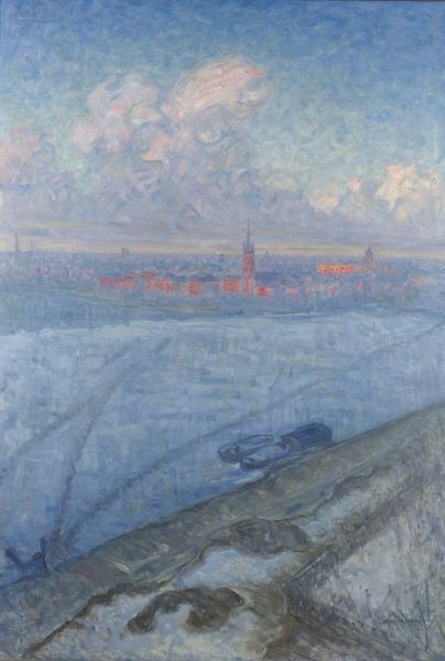 Editor: Tadeusz Makowski's "Bridge on the Seine," painted in 1908, rendered in tempera. It’s quite a subdued painting, all muted blues and greys. What can you tell me about it? Curator: I see a meditation on the industrial means that produce both the bridge itself, and, significantly, the very materials Makowski employed. Consider tempera - the binding of pigment relies on readily available substances, traditionally egg yolk, a departure from pricier oil paints, placing it more within a lineage of craft than "high art," if you will. Editor: So you're saying that his choice of materials has significance? Curator: Precisely. The bridge, a symbol of industrial progress and social connection, is constructed, assembled, by laborers. The paint, similarly, requires specific, physical means for production. Makowski subtly directs our attention to labor itself as the subject, much like the Impressionists’ engagement with modern life and the city’s constant state of material flux. What textures do you observe? Editor: The surface seems rough, not smooth like you'd expect from some other tempera paintings. It gives a tactile quality. Curator: It emphasizes the manual process, wouldn’t you say? A tension exists here: mass-produced elements composing the bridge represented using artisanal materials, applied directly. The image encourages reflection on industrialism's impact on individual experience. Editor: So, instead of just seeing a pretty picture of Paris, we’re supposed to consider the conditions that made it, and the picture itself, possible? Curator: Exactly. It becomes a visual document of material relationships and production processes central to early 20th-century life. Editor: I see it now – it's not just a scene, it's about how things are made and what that means. Thank you. Curator: A pleasure. Always question the assumed separation between art and its conditions of production.