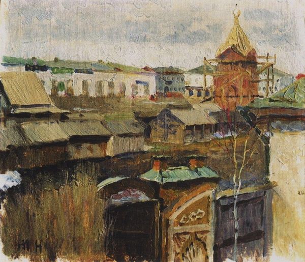 Editor: We’re looking at Féliz Ziem's “Tobolsk, Sibérie,” created with oil paint in 1844. The immediate feel I get is warmth, surprisingly – that golden dome shimmering under a blue sky. How do you see it? Curator: That shimmer gets me too, as though the sun's whispering a secret to the city. But beyond the literal depiction, it speaks to the idea of finding beauty in what might otherwise seem like a distant or even harsh place. What do you make of how Ziem uses light here, and does it remind you of other painters you've studied? Editor: Now that you mention it, that contrasting light reminds me of baroque painters...but, what exactly is baroque about it? I see a landscape and it's quite realistic, actually. Curator: Perhaps its that theatrical drama, wouldn't you say? Like spotlighting on a stage? The city and its church take centre-stage against the celestial backdrop. Maybe "realism" is about a moment perceived with artistic license, through an idealising lens? Think how his work diverges from cold documentation to, well, perhaps a dream of Tobolsk. What stories does this picture seem to want to whisper to you, based on your personal memories? Editor: A dream of Tobolsk... I like that! I'm now seeing more romanticism than documentary in it; the colours are vivid! It speaks of distant journeys and imagining unknown places. Curator: Exactly! Art transcends the merely seen and invites you to touch it. Now, imagine this "dream of Tobolsk" echoing across generations, wouldn't it encourage future visitors? Editor: Definitely! And perhaps encourage them to perceive the city, as you suggested, with an appreciative gaze!