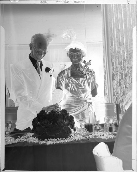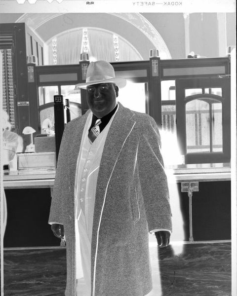 Curator: This photograph, by Jack Gould, is titled "Untitled (man in suit sitting in armchair)" and is currently held at the Harvard Art Museums. It is a gelatin silver print, measuring approximately 5 by 4 inches. Editor: The first thing that strikes me is the odd tension; the photographic negative gives it an eerie, almost ghostly pallor, while the man's attire suggests power and control. Curator: It's interesting to think about the production of this image in relation to labor. The sitter's suit speaks to specific social standing and economic possibilities, while the photographer captures it all. Editor: Right, and how does this performance of masculinity intersect with broader cultural narratives about success? It feels like a study in privilege, frozen in time through the photographic process. Curator: Yes, the material here reflects a certain amount of wealth and status. Editor: It certainly gives me a lot to think about; its starkness is particularly effective, even provocative, today. Curator: I agree. The starkness does highlight questions around class and representation.