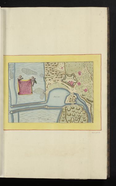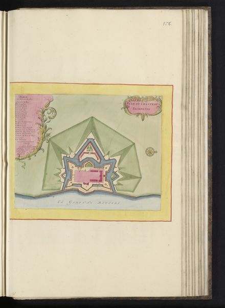Editor: This is an anonymous map, titled "Vestingplattegrond van La Rochelle," dating from around 1690 to 1700. It’s a watercolor and ink drawing on paper. What jumps out to me is how geometric and almost playful it looks, despite depicting what was surely a place of conflict and strategic importance. How do you read this particular visual representation? Curator: This isn’t just a map; it’s a visual encoding of power, memory, and aspiration. Notice how the city is presented, almost gem-like with its colored sections – pink, green, outlined in dark ink, resembling fortifications. What do these stylized choices evoke for you? Editor: Well, the colors are pretty, so it initially gives a sense of prosperity and order. But I imagine the imposing fortress design must have been perceived very differently by the people inside, compared to those outside. Curator: Exactly! The geometric layout, with its star-shaped fort and elaborate water defenses, isn’t merely descriptive. It’s symbolic. The geometry speaks of control, rational planning, and a vision of impregnability. These geometric shapes were themselves symbols understood within a larger political and social language. Can you see how such visual language creates a shared cultural understanding, solidifying social structures, influencing those who see it? Editor: I do. It makes me think about how we use maps today – not just for navigation but to project ideas about territory and identity. It is amazing how potent a seemingly neutral image can be. Curator: Precisely! Even practical images carry cultural weight, expressing ideas that extend far beyond its immediate purpose. This has been so insightful, to view maps as more than just practical drawings, and something filled with layers of intent and perspective.