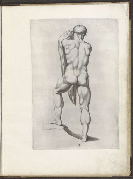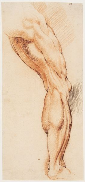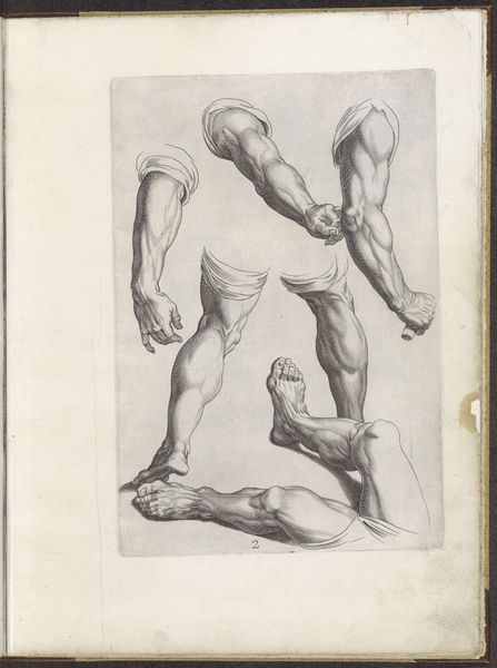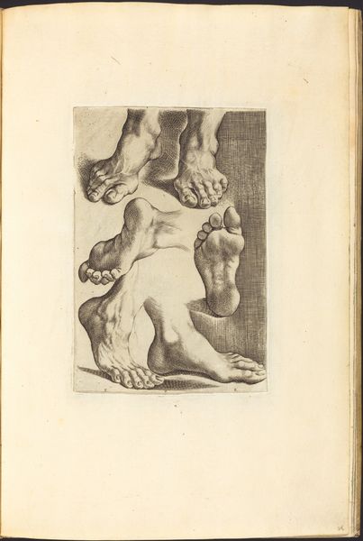 Curator: The anatomical precision is remarkable, wouldn’t you agree? Editor: It feels incomplete, unsettling somehow. Like a fragment torn from a larger narrative or study. The stark contrast also evokes a powerful sense of isolation, of disembodiment. Curator: That's a perceptive reading. What we are seeing is a print from a drawing book by Luca Ciamberlano, dating from around 1610 to 1620. It's an etching of the lower body, most likely intended for other artists as an exercise in depicting human anatomy. The Baroque style emphasizes drama. Editor: The very fact that the focus is solely on the legs transforms their cultural meaning. Legs are active things, enabling motion, exploration—in effect, a foundation for self-determination and agency. Rendering them in such precise detail almost hyper-realizes their function, stripping the image bare of metaphor. What is Ciamberlano telling us by focusing on this small part of the human form? Curator: During this period, there was renewed interest in the classical ideal but the Roman Catholic Church strongly influenced interpretations of nudes. In that era, a concentration on physicality alone, especially through academic study, can imply human fallibility, not perfection. These are simply limbs depicted for technical understanding, nothing more and nothing less. It strips away layers of accumulated meaning. Editor: Still, I'm left pondering the implications. The choice of body parts transforms these limbs into synecdoche for something greater; perhaps, this academic exercise points at the era's fixation on dissecting the body. It suggests mortality, human imperfection... vulnerability even within a work so focused on idealized form. Curator: I concur that the work pushes past pure anatomical depiction into a dialogue between form, technique, and philosophical awareness. We've explored the rich, almost unnerving stillness that underlies what seems at first to be only a technical drawing, as well as its implicit commentary on the human condition. Editor: A worthwhile encounter, indeed.