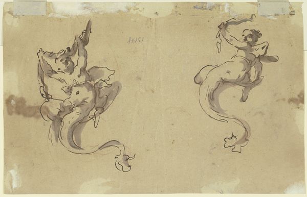 Giovanni Domenico Tiepolo made this drawing, A Sea Horse and a Dolphin, with pen and brown wash on paper. It's interesting to consider Tiepolo's process here. He used humble materials - paper, pen, and diluted ink - to achieve a vivid sense of form. The brown wash creates depth and volume, giving the figures a sculptural presence despite being on a flat surface. You can almost feel the weight and texture of the mythical creatures. Tiepolo was working within a long tradition of draftsmanship, but he brought his own flair. The speed and confidence of the lines suggest a practiced hand, someone deeply familiar with both anatomy and artistic convention. The fluidity of the ink mirrors the aquatic subjects, creating a sense of movement and life. Ultimately, this drawing reminds us that artistic skill isn't always about expensive materials. It's about vision, technique, and the ability to transform ordinary materials into something extraordinary. It is in the end about bringing imagination to life through skillful manipulation of simple means.