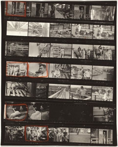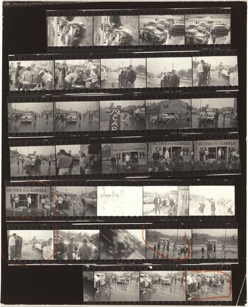 Curator: Robert Frank’s 1955 gelatin silver print, “Guggenheim 309--Scottsboro, Alabama,” offers a striking composition, doesn't it? The photo presents several frames of film that serve as distinct narrative cells. Editor: Immediately, the repetition catches my eye. It's like a visual echo. I am drawn into how people are dressed and framed together with vintage buildings and shops. The symbols of "Coca Cola" appear like cultural reminders of the mid 50's America, adding to the historical narrative. The high-contrast tonality evokes a feeling of austerity and directness. Curator: The image captures the era's zeitgeist through an unflinching lens. The details aren't merely descriptive, rather, Frank is addressing social commentary with precision. What kind of emotional or cultural undercurrents are evoked in this town with its historical setting? Editor: The repetition of figures clad in similar attire, clustered yet seemingly disconnected, tells me something about communal identity in transition, but with this high contrast presentation I sense anxiety within that identity as well. Curator: Certainly, and let's consider the implications of the title, linking this street scene to Scottsboro, Alabama, immediately recalls the infamous Scottsboro Boys case. The legacy of injustice becomes an unspoken layer to this piece, thus shifting our perceptions to consider themes of discrimination, law and history. Editor: Precisely. Each image cell serves as an echo chamber for shared histories and maybe, secrets, of a town deeply involved with social themes. By choosing photography, Frank's approach becomes an unvarnished method for understanding cultural moments. Curator: By placing these visual clues together, Frank provides viewers an opportunity to reconcile shared American history with imagery, thus creating new interpretations. It seems to be a blend between capturing and commentary, wouldn’t you say? Editor: Indeed, Frank makes it clear to use a raw yet accessible language when talking about symbols. Curator: Well, looking at this piece helps clarify not only an historical setting, but reminds viewers that public art holds opportunities for communal memory. Editor: Right, seeing this reminds me to contemplate symbols. They reveal enduring aspects within changing contexts of place and time.