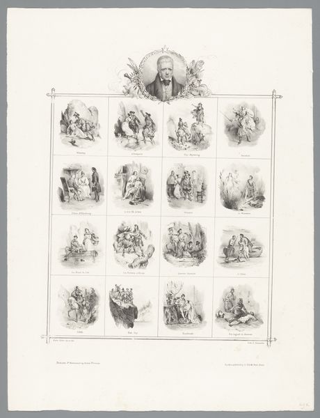 This print, made by Victor Adam, probably dates from the mid-19th century and presents a portrait of François-René de Chateaubriand, surrounded by scenes from his novel "Atala." As a lithograph, this work originates from a fascinating process. The image was drawn with a greasy crayon onto a flat stone, which was then treated with chemicals so that ink would adhere only to the drawn areas. This printmaking technique allowed for relatively quick and inexpensive reproduction, fitting into the burgeoning print culture of the 19th century. We can see how the artist uses the qualities of the lithographic process to create subtle gradations of tone and intricate details, mimicking the effect of a finely rendered drawing. The rise of lithography coincided with the industrial revolution, and the development of mass culture. The availability of images like this speaks to broader shifts in labor, politics, and consumption. It makes art and literature more accessible. By considering these factors, we gain a deeper understanding of the social and cultural significance embedded within this print, challenging traditional notions about art and craft.
