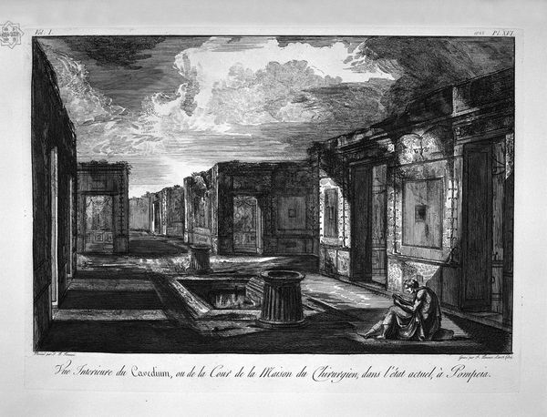 Editor: This engraving, "View of the Temple of Isis… Pompeii", is attributed to Giovanni Battista Piranesi. I’m immediately struck by how this print romanticizes ancient ruins with the everyday life happening all around the fallen structures. It makes me think about the passage of time. What emotions or ideas does this provoke in you? Curator: Oh, absolutely! I see it as Piranesi inviting us into a kind of dreamscape, where past and present dance together in a bittersweet ballet. You have these meticulously rendered ruins – almost stubbornly magnificent in their decay – but look at the people populating the scene. They are shopping, talking… just going about their daily business, completely unfazed by the echoes of a lost civilization. Don't you think it's delightfully odd, that contrast? Editor: It really is! The more I look, the more those details pop. Like, that little dog trotting around – it's a wonderfully banal touch in such a grand setting. But I keep coming back to those stark contrasts. How can this single image make us feel so many different things? Curator: Well, I think Piranesi’s genius lies precisely in that juxtaposition. The ruins aren't just stones and columns; they're ghosts whispering stories of ambition and demise. And those people? They're us, trying to live our lives amidst the debris of history, maybe without even realizing what we're walking through. What do you think – are they ignorant, or wise in their seeming indifference? Editor: Maybe they’ve just learned to live with it… or maybe we're imposing our modern sensibilities onto their world. I suppose what I’m taking away from this is the reminder that time keeps moving, no matter what’s left behind. Curator: Beautifully put! It's as if Piranesi captured time itself – its ability to both crumble and create. Leaving us, centuries later, to still wander those same ruins in our minds.