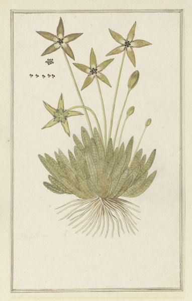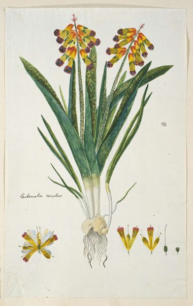 Robert Jacob Gordon made this watercolor drawing of Ixia viridiflora, or Turquoise Ixia, sometime before his death in 1795. Gordon was a Dutch explorer, soldier, and naturalist, and his work reflects the context of scientific exploration during the Enlightenment. During this time, the Dutch East India Company had a significant presence in South Africa, where this particular species of Ixia is native. Gordon's botanical illustrations served a dual purpose. They documented the natural world for scientific study and showcased the exotic flora of the Cape Colony to a European audience. The precise detail and delicate rendering of the plant reflect the values of scientific observation, while the aesthetic choices in composition and color speak to the cultural norms of botanical illustration. The drawing's existence today owes to the efforts of art historians, botanists, and other researchers, who piece together the fragments of the past to give us a fuller understanding of the complex relationship between science, art, and colonialism.