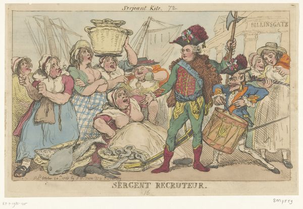 "Scandal Refuted or Billingsgate Virtue" is a print by Charles Williams. The scene is set with a flurry of activity, populated by figures whose expressions and postures convey a sense of lively discourse. The organization of the composition is structured around a central gathering of individuals, with supporting characters and environmental details filling the space around them. The artist has utilized hatching and cross-hatching to build form and texture, creating a visually rich surface that invites close inspection. This technique adds depth and volume to the figures. The colour palette employed by Williams is restrained, but strategic accents of stronger hues, like blues and reds draw the eye. The text bubbles scattered throughout the image contribute to the complex interplay between visual and verbal elements. These additions function as signs, directing our interpretation of the scene and suggesting a narrative beyond what is immediately visible. This reflects a broader concern with how meaning is constructed through language and representation. The formal structure of the artwork serves as a foundation for engaging with the social commentary and narrative complexity it conveys.